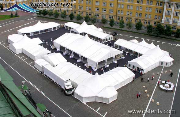 La luz máxima de la carpa combinada Guangao es de 65 metros y la lona seleccionada es de 850 g/metro cuadrado.La estructura interna de la carpa tiene un alto rendimiento de seguridad y es adecuada para bodas, celebraciones, reuniones, exposiciones, banquetes, etc. Tiene ventajas funcionales y apariencia única.