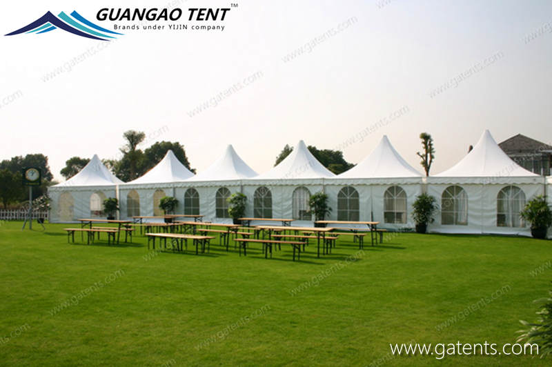 La tente de pagode est un nouveau type de construction provisoire pour des événements extérieurs. Elle contient non seulement des formes de pointe et de tente de c?ne, mais inclut également beaucoup de formes telles que le haut de chevelure, le haut d’arc, etc. La tente de pagode appartient à l’auvent économique. Les principales caractéristiques sont la lumière et l’installation plus rapide que l’auvent régulier, plus économique et pratique. Peut répondre aux exigences des clients sur la taille de la tente de c?ne. En particulier, nous sélectionnons la toile d’ombre faite de fibres synthétiques importées plus trois couches de matériaux de PVC. Le poids de bache d’épaule est 650-850g/SQM, la performance peut entièrement atteindre les normes européennes et américaines, le traitement délicat de la partie du cadre et le traitement répondent aux normes de sécurité.